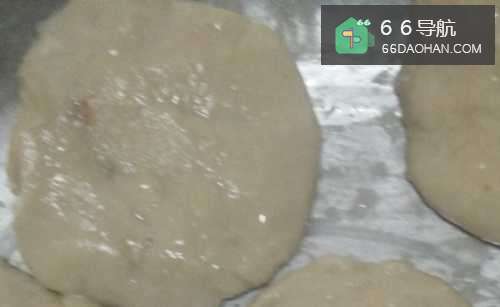 3取出一个小面团,将小面团在手里揉成圆球,再将圆球用手压成都饼子状,再用适当的工具,从碗里取适量的糖放在小饼子上。