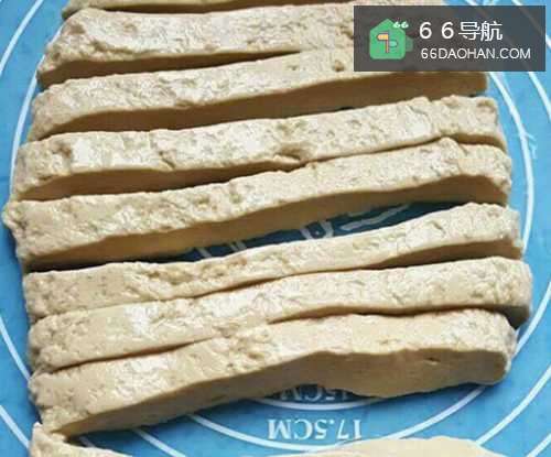 2然后把醒发好的谷朊粉,来回揉搓之后摆成长方形,在案板上用菜刀切成如图。