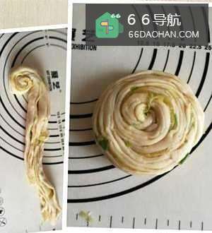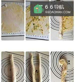 2取一部分面团擀成薄片,上面均匀抹层油,均匀撒层盐,然后放事先调好的油酥,由下向上卷起(要卷紧)再由中间切开,再切面向上卷起