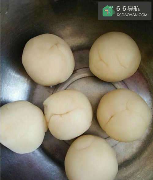 4把面团分成数个大小相同的小面团,揉圆按扁包入白糖馅,然后再揉圆按扁。