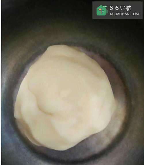 2转小火加入面粉,搅拌至无干粉,不沾手关火。