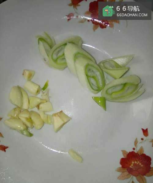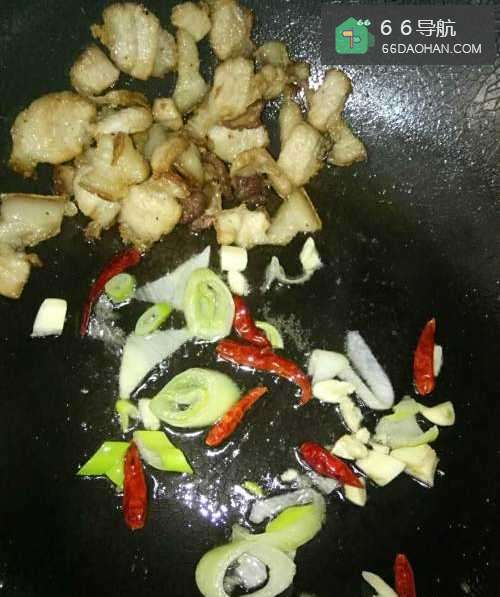 4将五花肉入锅煎出油,再下大葱、蒜头和辣椒;