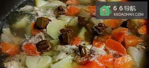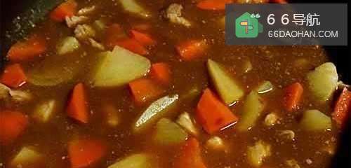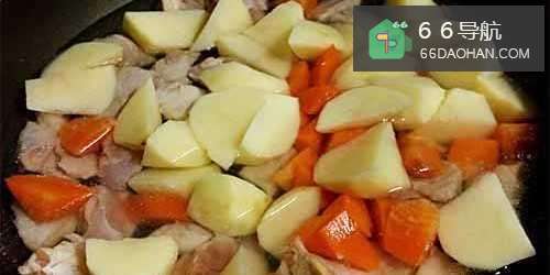 3放入马铃薯及胡萝卜块,倒入水后盖上锅盖,以小火煮滚并至马铃薯可用筷子刺穿的程度。