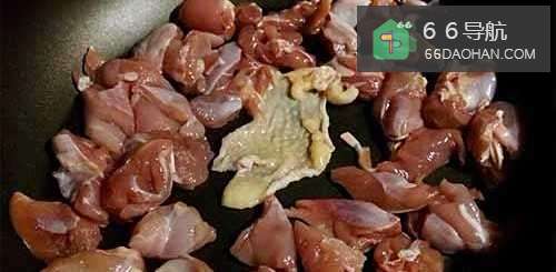 2不沾锅不用加油,放入鸡腿块与鸡皮,煸出油脂后将鸡皮取出丢弃。