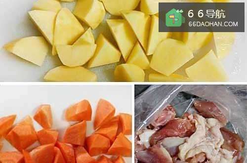 马铃薯及胡萝卜分别去皮切滚刀块(马铃薯切大块、胡萝卜切小块);鸡腿排去皮后切成小块,留下一小片鸡皮备用。
