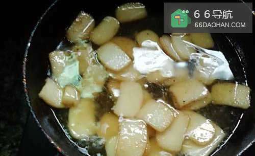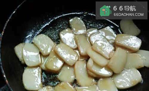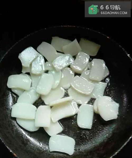 4将年糕片放入锅中翻炒一会儿,翻炒过程中可能年糕会彼此粘在一起,但不用担心。
