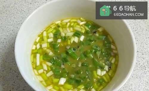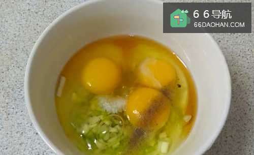 3放葱花,蛋碗里打入三颗蛋,再加入香油、胡椒粉,少许的味精和盐打散。