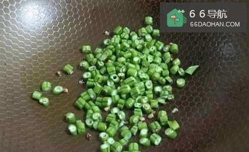 2锅内放少许油,先将菜豆放入,稍微拌炒后加入半杯水焖熟。