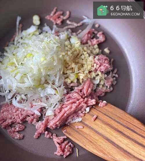 2将平底锅加热,将猪肉末放入油锅中,再加入切好的葱白和姜末一起翻炒。