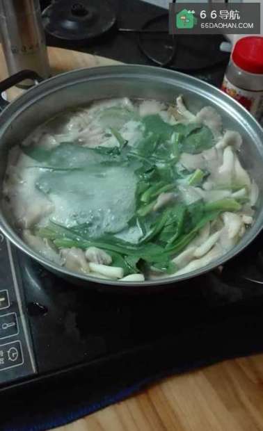 3待鸡肉炖熟时,加入秀珍菇,再熬上5分钟左右,倒入青菜煮一会,待青菜快煮熟时加入少量味精进行调味。