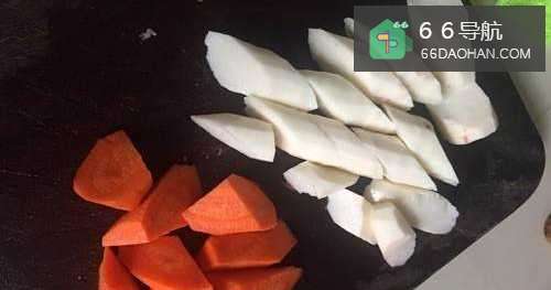 2将淮山和胡萝卜切成滚刀块,放盘备用。