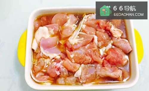 3把剔骨后的鸡腿肉切成中等大小的鸡肉块,放在蒸碗里面备用。