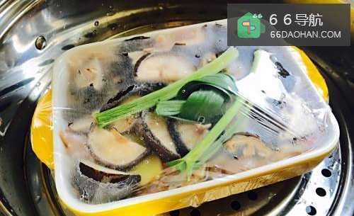6接下来就是将切好的香菇依次摆在盘子里,最后放上葱结,用保鲜膜包上,同时用牙签戳几个洞准备上锅蒸。