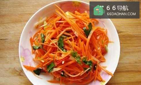 把胡萝卜切成丝,加生抽、盐、糖、鸡精、蒜末拌匀,加点香菜点缀最好了,淋上芝麻油就好了。