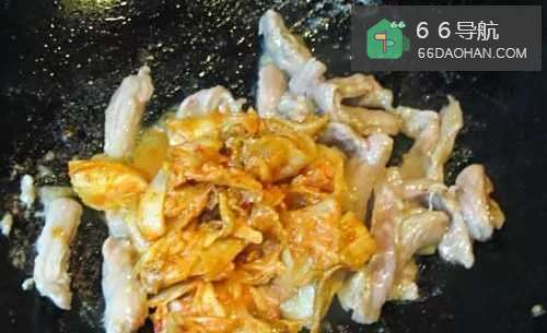 4加入泡菜,连同泡菜汁快速拌炒到不见生肉色就可以起锅了。