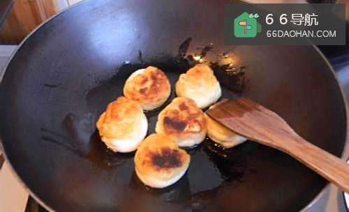 20待煎到底部微焦,翻过来,用木铲轻轻压扁面剂子,排出面团里面的气。