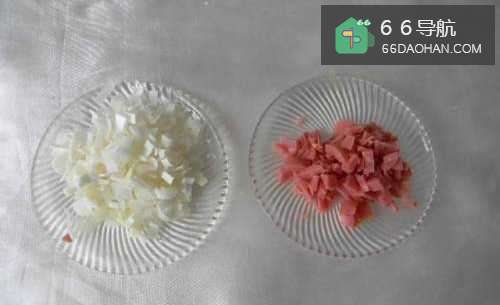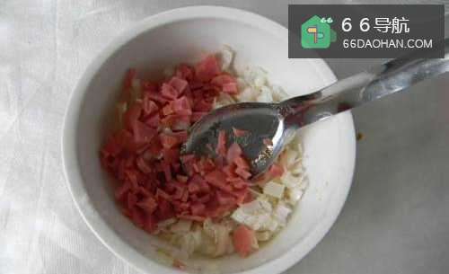 8加点胡椒粉和味素,加适量盐,倒入火腿丁。