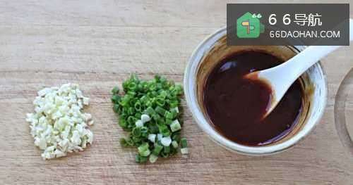 4小碗中调入生抽、蚝油、糖、番茄酱和玉米淀粉,搅拌均匀成调味汁,切葱花和蒜末备用