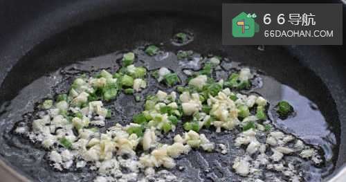 5锅中倒食用油烧至五成热,放入葱花和蒜末小火炒香