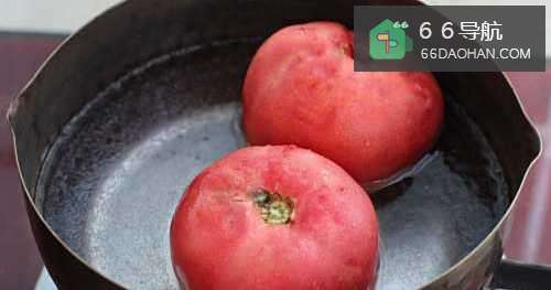 2番茄表面划十字刀,放入开水中烫煮约三十秒捞出冲凉水