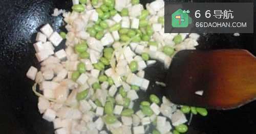 3炒锅中重新加入油(1汤匙),烧至六成热,倒入毛豆仁和茭白丁翻炒,