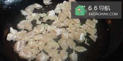 锅烧热,倒入油(1汤匙),放入姜丝爆香,倒入腌制好的鸡丁滑炒至变白盛出。