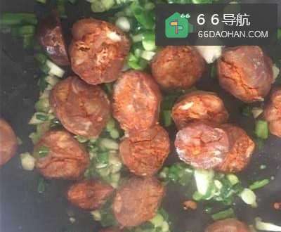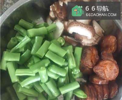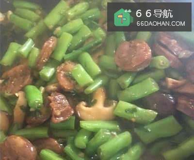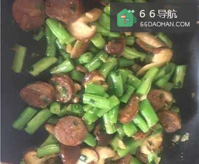 3先炒川味腊肠,肉食要熟才卫生,先炒个5成熟,再加入豆角和蘑菇;