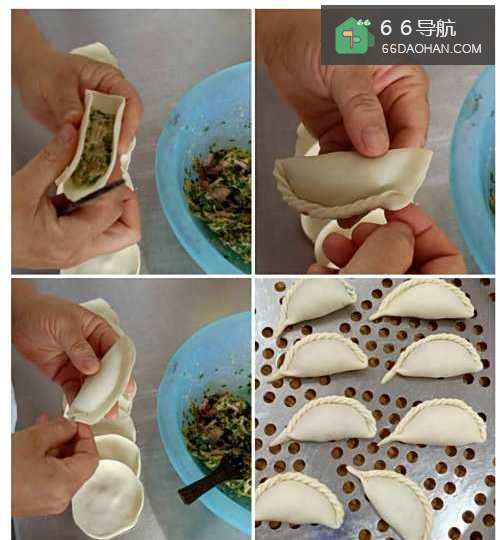 4装馅料,左手托着饺子皮,右手大拇指配合食指按压成形,锁成眉毛形。