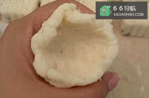 4包馅儿,取出一块山药泥,捏成碗状,里面加入一块红豆泥。