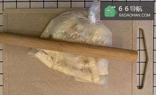 3取出山药,放入保鲜袋用擀面杖碾成泥,同时,糯米粉放入微波炉叮两分钟。