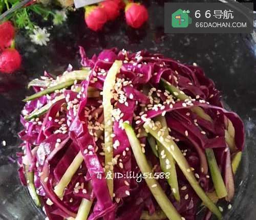 紫甘蓝的色泽艳丽、营养丰富,黄瓜的清香,加上白芝麻的香味,有紫的,绿的,白的,这一道凉拌菜真是漂亮极了。