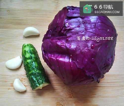 将紫甘蓝老的叶子去掉,洗干净切丝,黄瓜切成长条丝,大蒜切片备用。