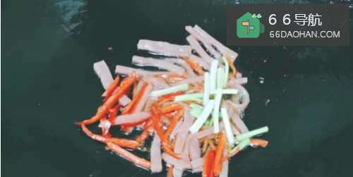 7把辣椒丝和葱白放入锅。