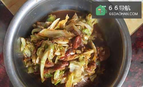 6如图,放入切好的包菜,并将其翻炒均匀。