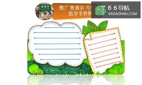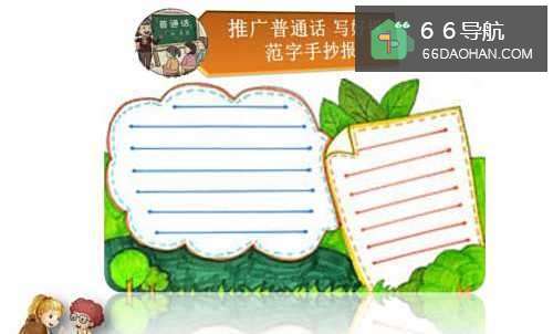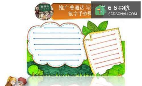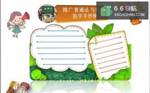 4在【推广普通话写好规范字手抄报】主题的底部右侧,画出学生及背景图案及【推广普通话写好规范字手抄报】主题的倡导词沟通从普通话开始,如下图所示。