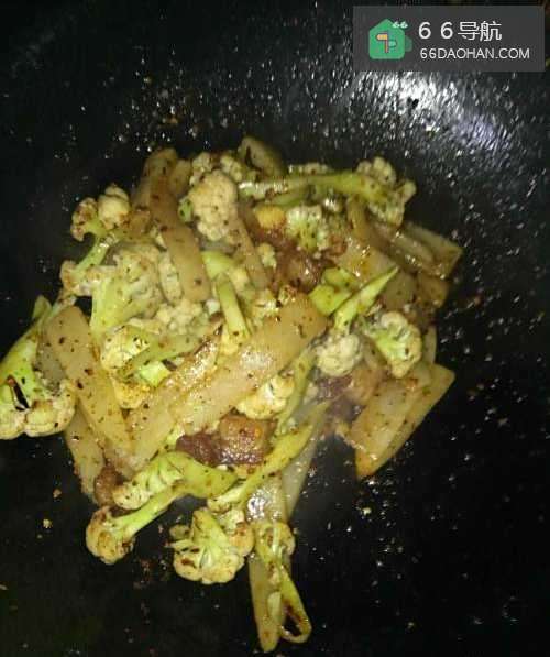 5待花菜翻炒至78分熟的时候,再将烫过开水的萝卜条下入锅里,一起翻炒;