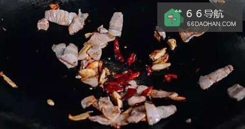 葱姜爆锅,然后下五花肉和干辣椒煸炒至五花肉出油。