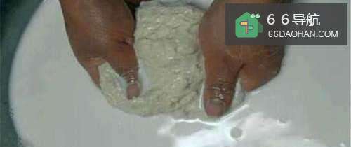 2将洗出来的面水倒在一起,静置几个小时,就会出现上层清水,下层沉淀的情况,将清水倒掉,沉淀面糊留下,把酵母放入面糊里面,搅拌均匀,然后发酵12个小时左右,放到锅中,炒干水分,就成了面团;