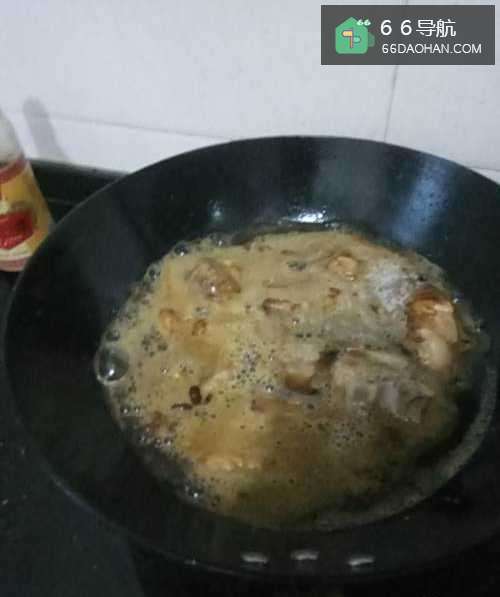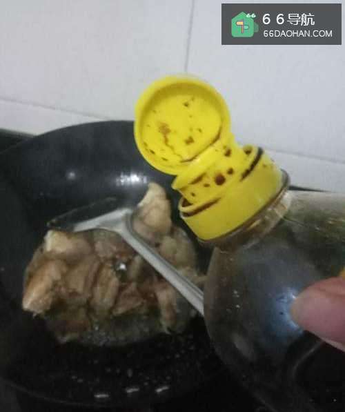 5等到排骨两面都煎至金黄色时,依次加入适量的生抽、老抽和可乐。