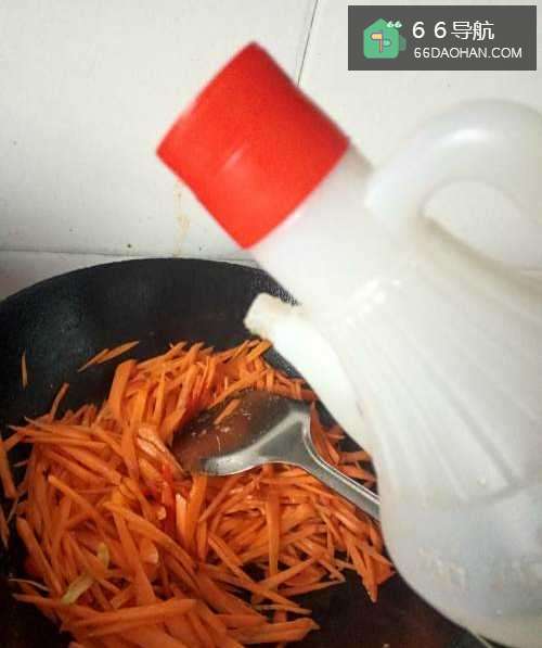 5胡萝卜丝翻炒一分钟加入适量的生抽,继续翻炒两下,然后加入之前炒熟的瘦肉丝继续翻炒一分钟,加入适量的食用盐和胡椒粉