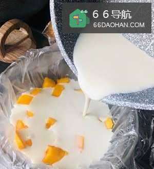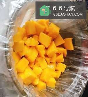 提前在容器里垫上一层保鲜膜,然后倒入芒果块、牛奶混合液体;