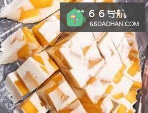 4把冻好的一大块芒果椰浆冻切成小块,就可以吃啦!