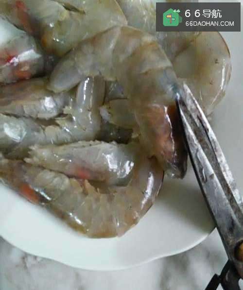 6因为虾太大,怕不入味,所以用剪刀把虾背部的壳剪开。