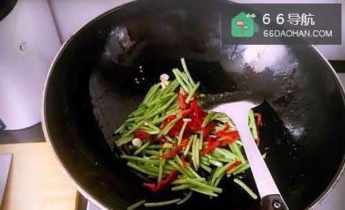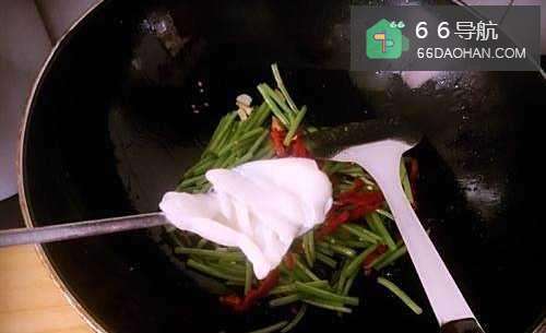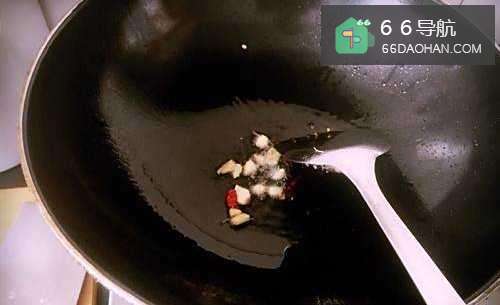 55.锅热油,依次放入生姜碎,干红椒及拍碎的大蒜子