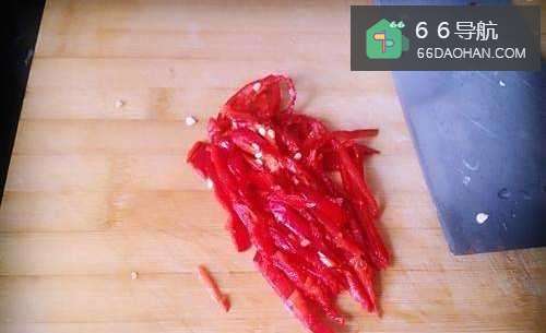 44.鲜的红辣椒去蒂去籽清洗干净,并切成细丝