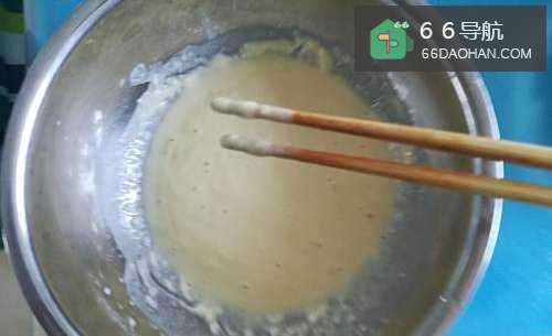 3另用一碗,倒入面粉,打入两个鸡蛋,搅拌成略稀的面糊。