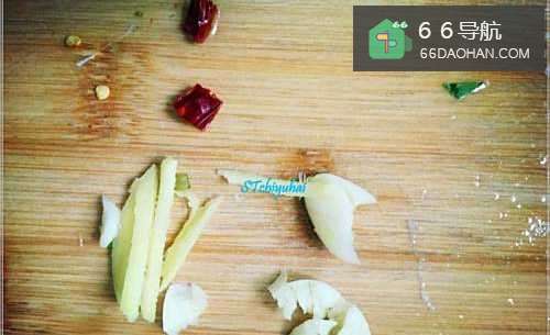 3准备少许辅料生姜洗净去皮切丝,蒜头拍碎去皮切末,准备一点辣椒干,还有一个很重要的佐料豆瓣酱。