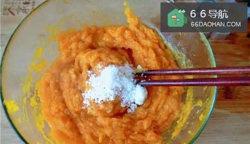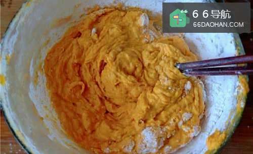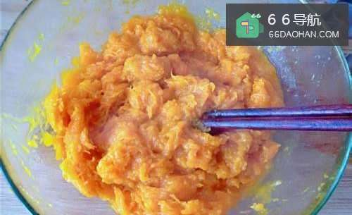 3将南瓜去皮后放入料理盆中,用筷子搅拌均匀。