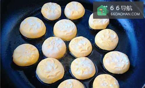 10平底锅中火烧至掌心灼热,倒入花生油10ml,油热后放入南瓜饼胚子转小火煎。