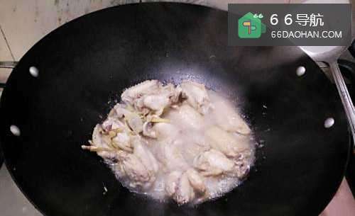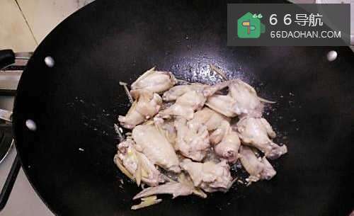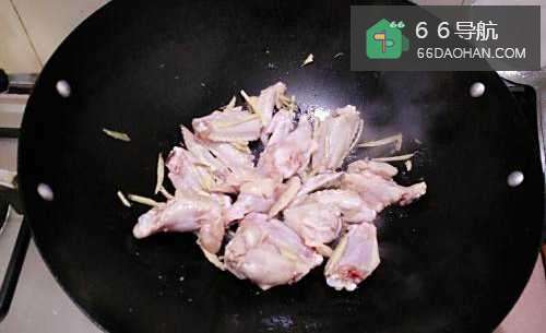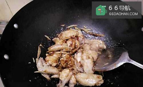 4将鸡翅倒进锅里,放点盐后翻炒一会,倒上一些水。